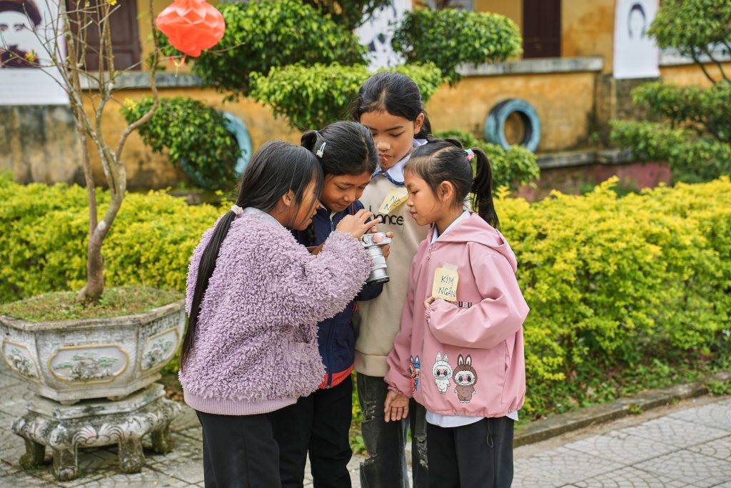 Students from Hong Van Primary School practiced landscape photography in the schoolyard.